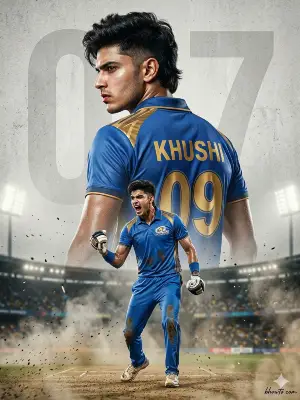 IPL Cricket Fan Image Prompt: A cinematic dual-pose cricket poster of a young man wearing the Mumbai Indians (MI) kit, set against a textured light-grey background with a faded “45” behind him. One pose shows his back view in a royal blue and gold MI jersey with “RO – 45”, turning slightly for an intense side profile. The foreground captures a powerful celebration, fist clenched and roaring with victory.Features photorealistic athletic detail, subtle sweat, cinematic smoke, dust, and sparks, dramatic stadium lighting, high contrast, and ultra-sharp 8K quality.