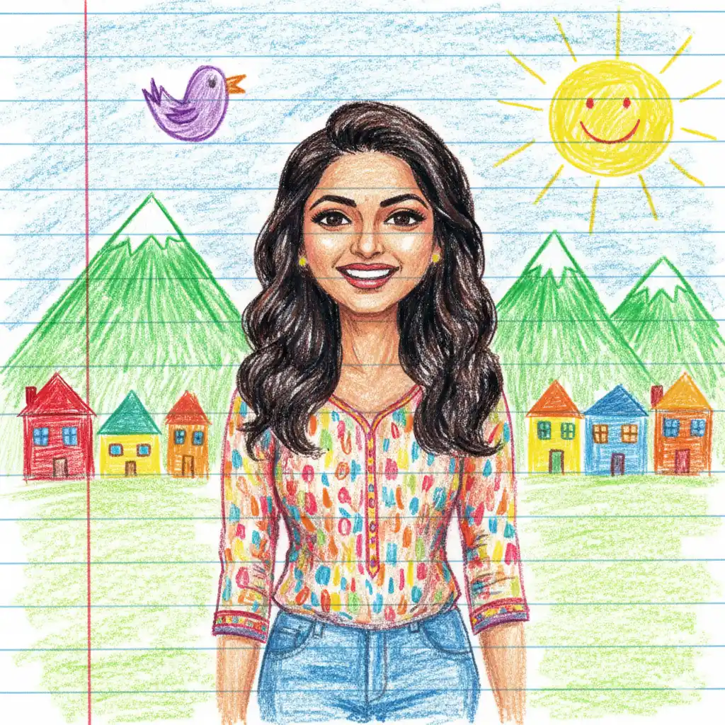 Transform the reference image into a cute crayon-style drawing on lined paper.Keep the original face shape, skin tone, hairstyle, expression, and clothing exactly as in the photo, but reimagine them with rough, uneven strokes and sharp outlines.• Use bright colors and random-looking textures, as if drawn by a child using crayons.Background: Add green crayon-drawn mountains, a bright yellow sun, an “M”-shaped bird, and colorful scribble-style houses.• Place the drawing on blue lined paper with a single red vertical line along the edge.• Maintain the general proportions of the person, but simplify the details to make it look more childlike and caricature-like.• Add some scribbles or imperfections to make it appear spontaneous and playful. 4:5 aspect ratio, notebook-style vertical design.”