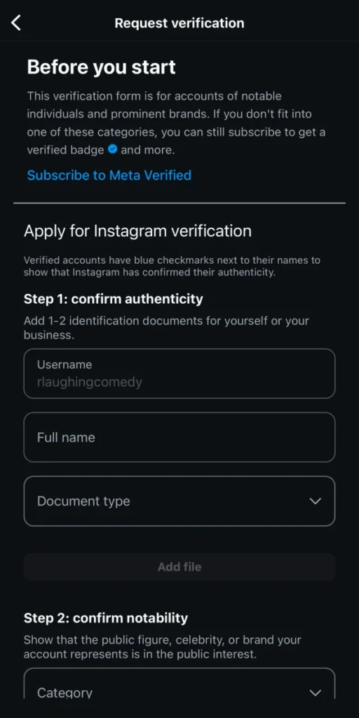 You can also get your account verified through Meta Verified Subscription which is a paid verification service offered by Meta in selected countries. Follow the steps to get your account meta verified: