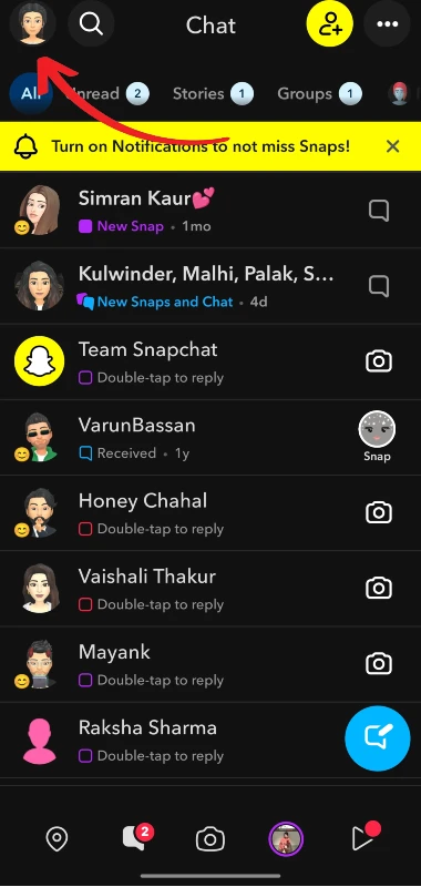 Step 2: Tap pn the profile icon or your Bitmoji in the top-left corner